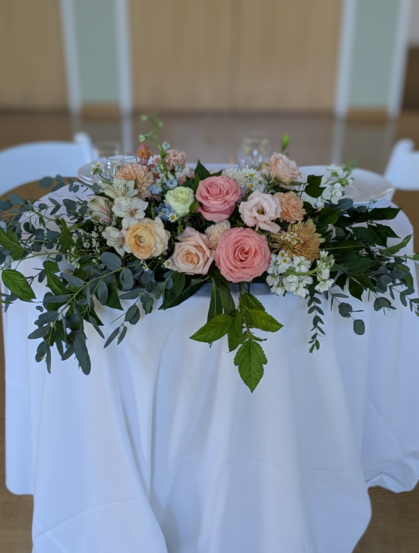 Our Long & Low Centerpiece is a beautiful statement piece, designed with draping greenery and lush blooms. This arrangement adds instant garden-inspired romance to your event and works perfectly on a sweetheart table or mantle.